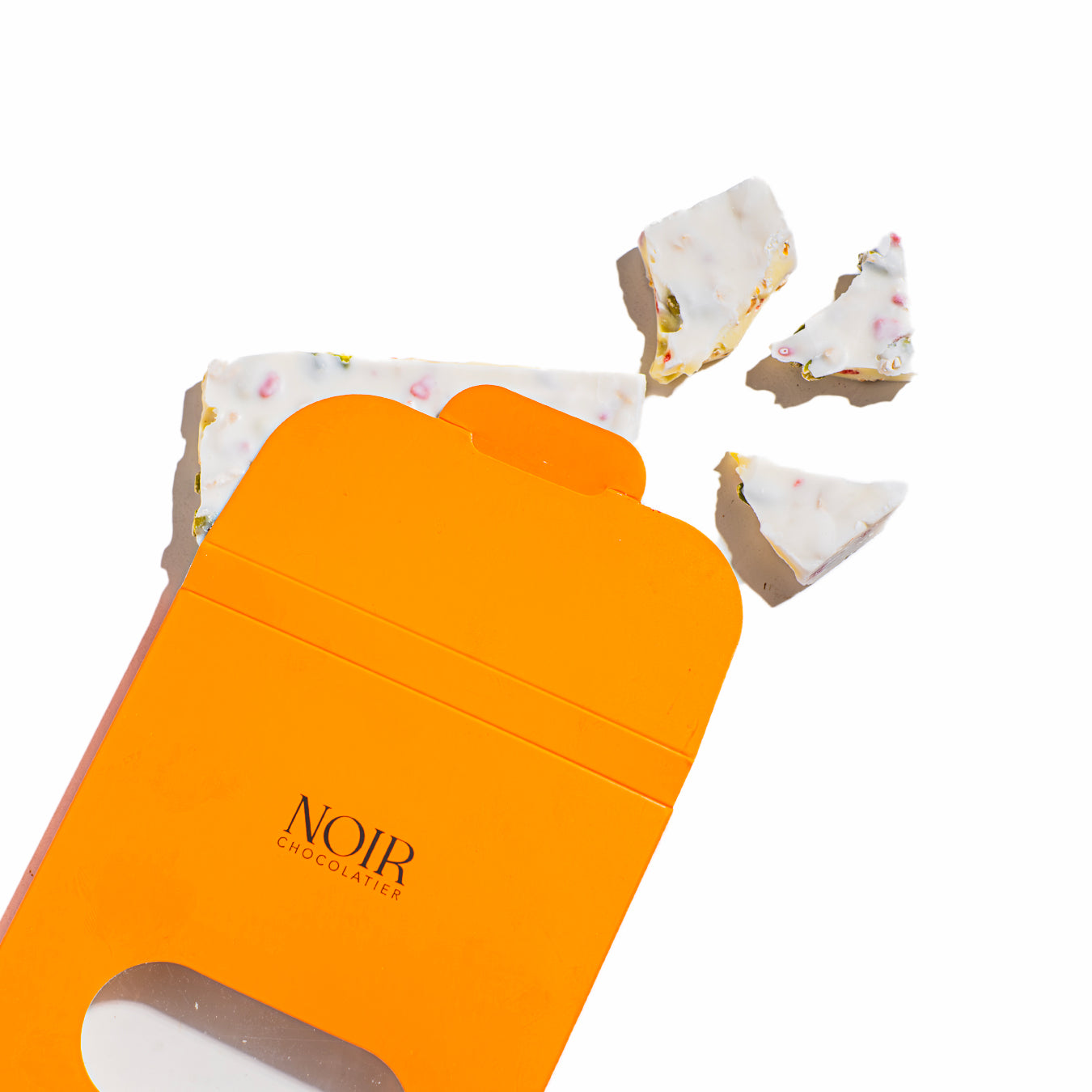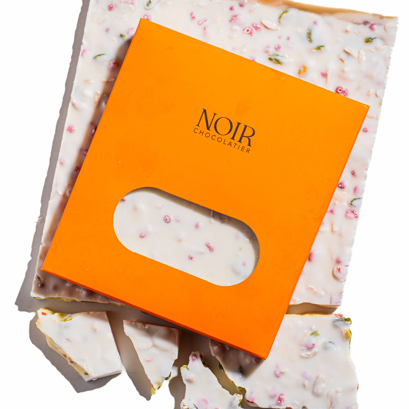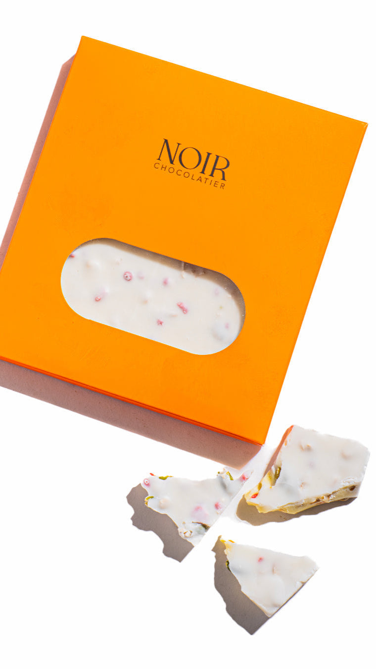 White Swiss chocolate squares elegantly presented in a pouch, filled with almonds and pistachios for an indulgence and perfect flavours 250g